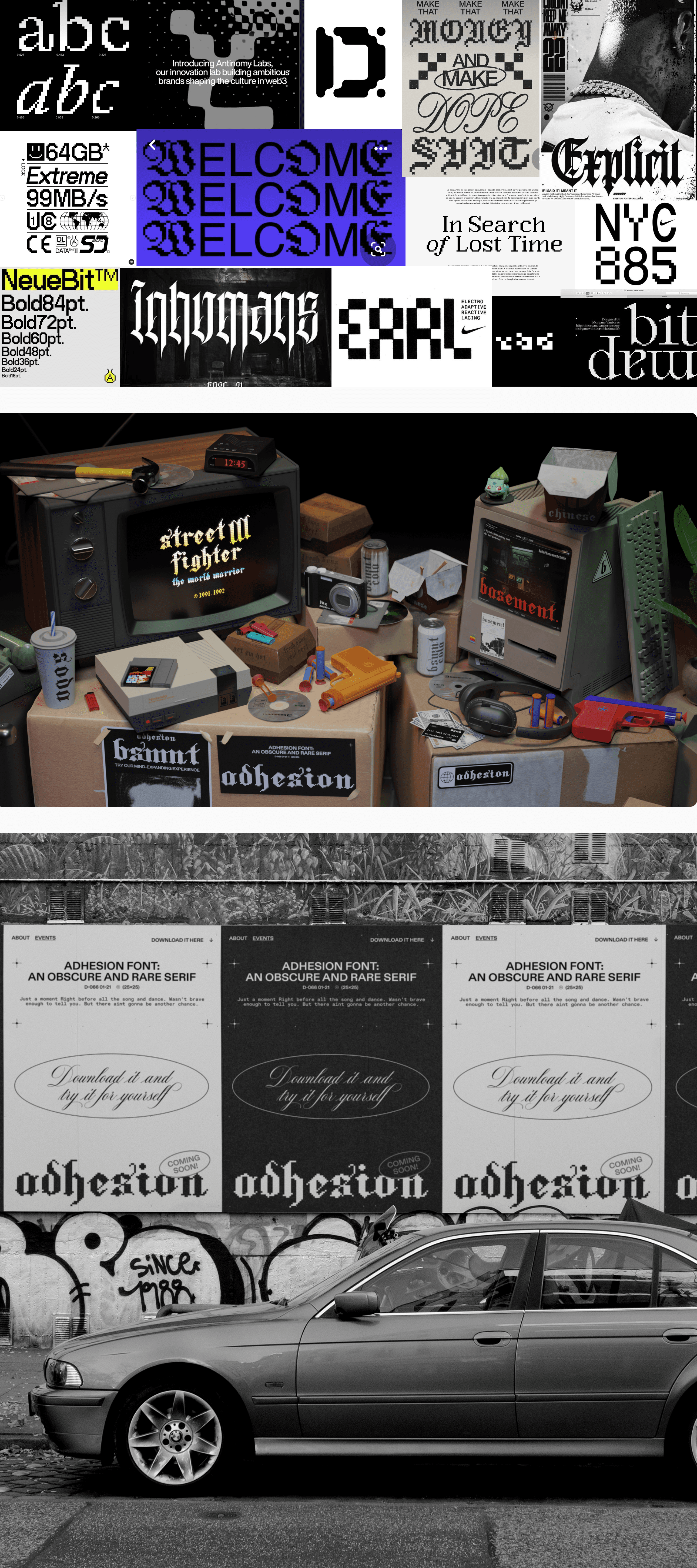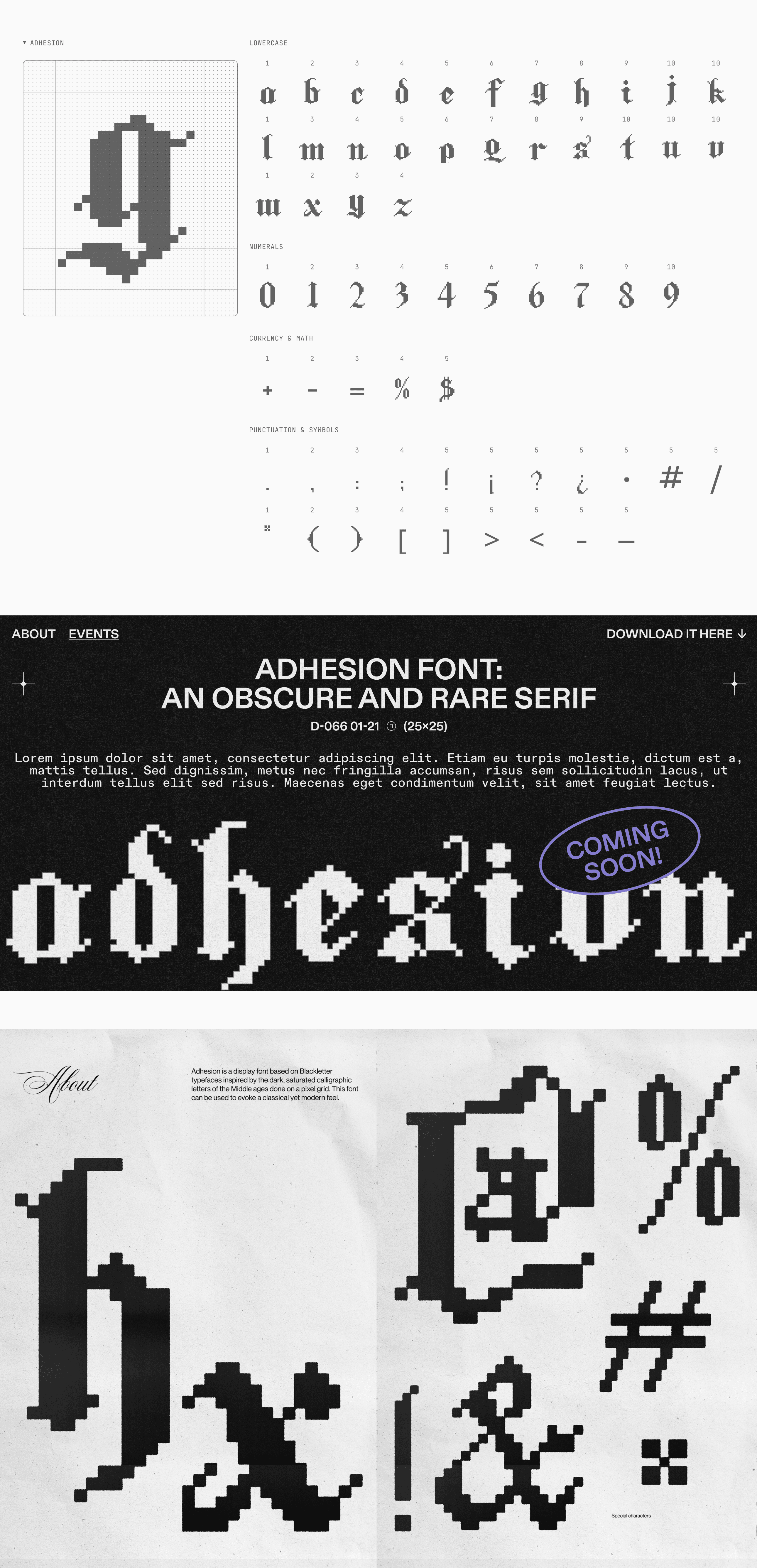 Adhesion is a custom blackletter typeface I designed as part of a project at Basement Studio. The idea was to reinterpret the traditional blackletter style through a modern, modular lens—keeping the richness and character of the original forms, but making them feel sharp, minimal, and adaptable to today’s design contexts.