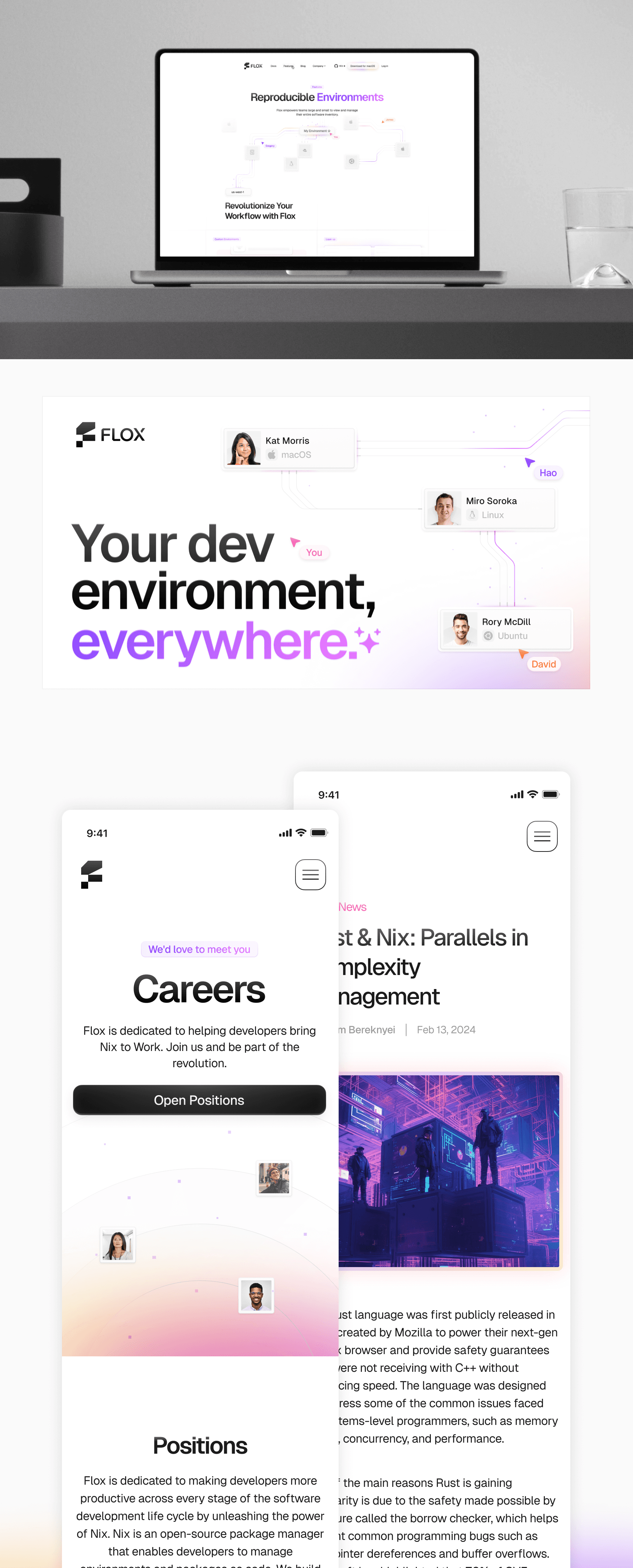 We redesigned Flox’s brand and website to better reflect its technical capabilities and connect more clearly with developers and teams. The new identity is clean and modern, while the site simplifies complex ideas to help users quickly understand what Flox is, how it works, and why it matters.